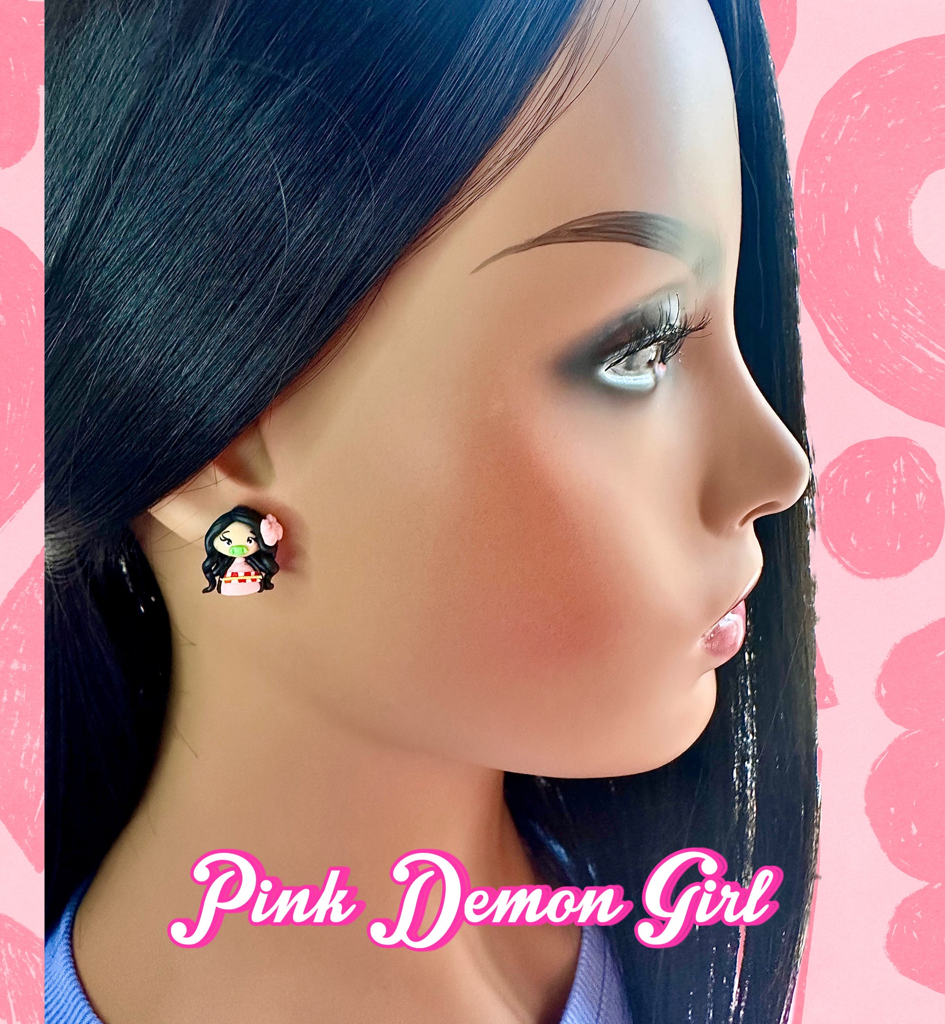 Unleash your inner protector with our Pink Demon Girl stud earrings! These handmade polymer clay charms feature a fierce yet adorable figure with flowing black hair, soft pink details, and a signature green accent that hints at her untamed strength and quiet spirit.